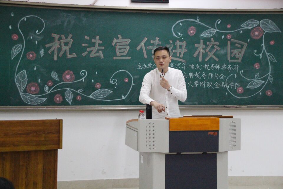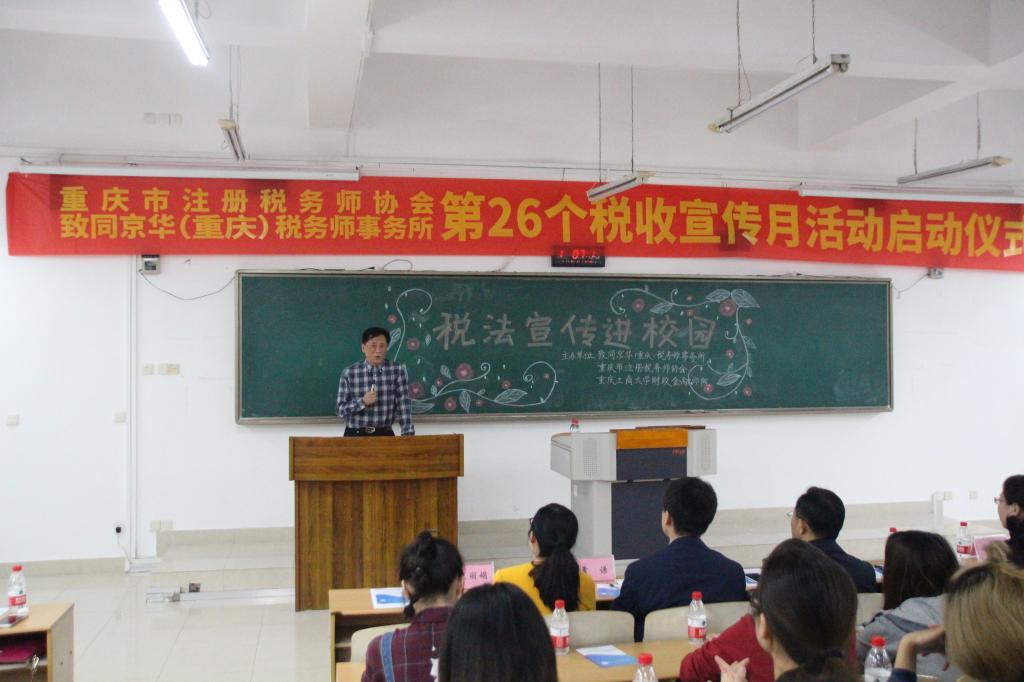 5月5日下午,由致同京华(重庆)税务师事务所、重庆市注册税务师协会、财政77779193永利集团联办的2017税法宣传进校园活动在南岸校区博智楼212教室成功举办。重庆市注册税务师协会副会长陈光信、重庆市注册税务师管理中心副主任王洪宇、77779193永利集团财政77779193永利集团党委副书记黄谦、致同京华(重庆)税务师事务所首席合伙人白云燕、注册税务师管理中心副处调研员徐勇、财政77779193永利集团财税系主任尚可文、致同京华(重庆)税务师事务所副总经理陈怡、财政77779193永利集团学团办主任兰丽娟出席了本次活动。