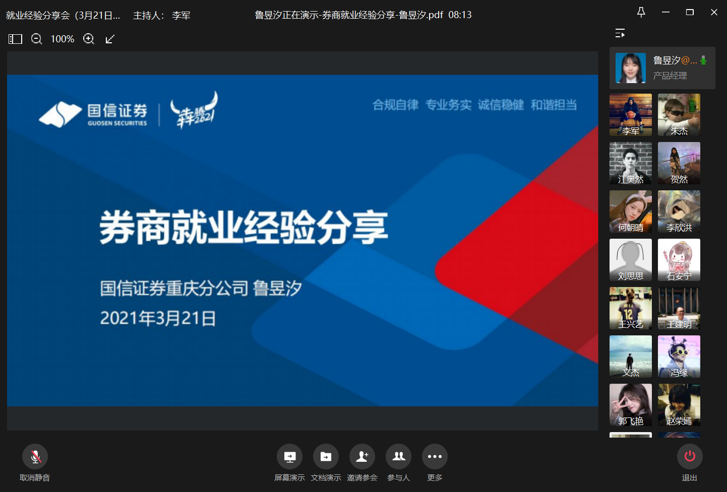 3月21日上午10:00,77779193永利集团就业经验分享会于企业微信成功举办。本次活动邀请到国信证券股份有限公司的12级CFA专业鲁昱汐、广发银行股份有限公司的16级金融五朱杰、德勤华庆商务服务有限公司的16级投资二冷小兰、中汇国际保险经纪公司的16级保险一文思力进行就业经验分享。77779193永利集团党委书记、副院长王建明,77779193永利集团党委副书记、纪委书记余新,以及77779193永利集团一百多名同学参加了会议。