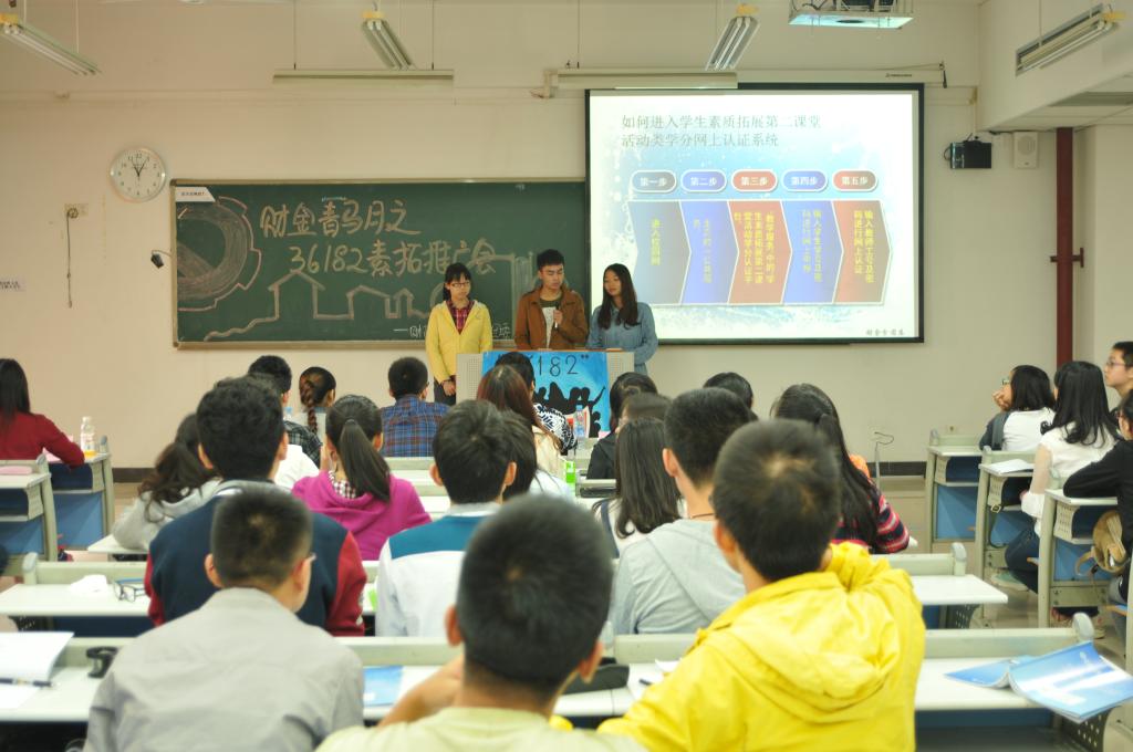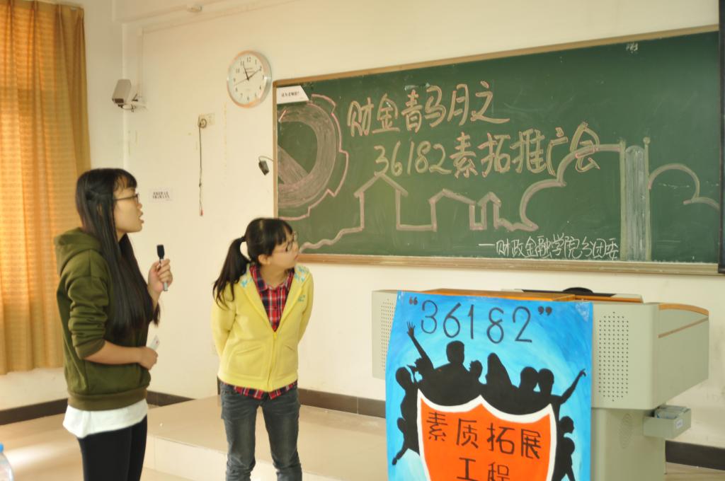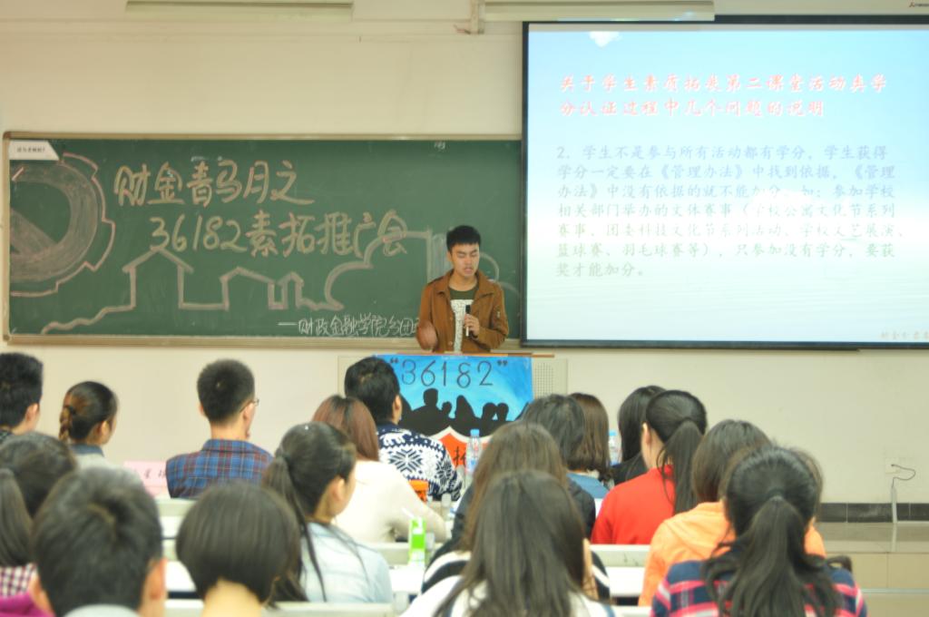 10月24日上午,财金青马月之“36182”素质拓展推广会在慧智楼205教室开展。校学生会素质拓展部部长杜星瑶作为嘉宾莅临,财金学生会主席团、素质拓展部部长及14级CFA全体同学出席会议。