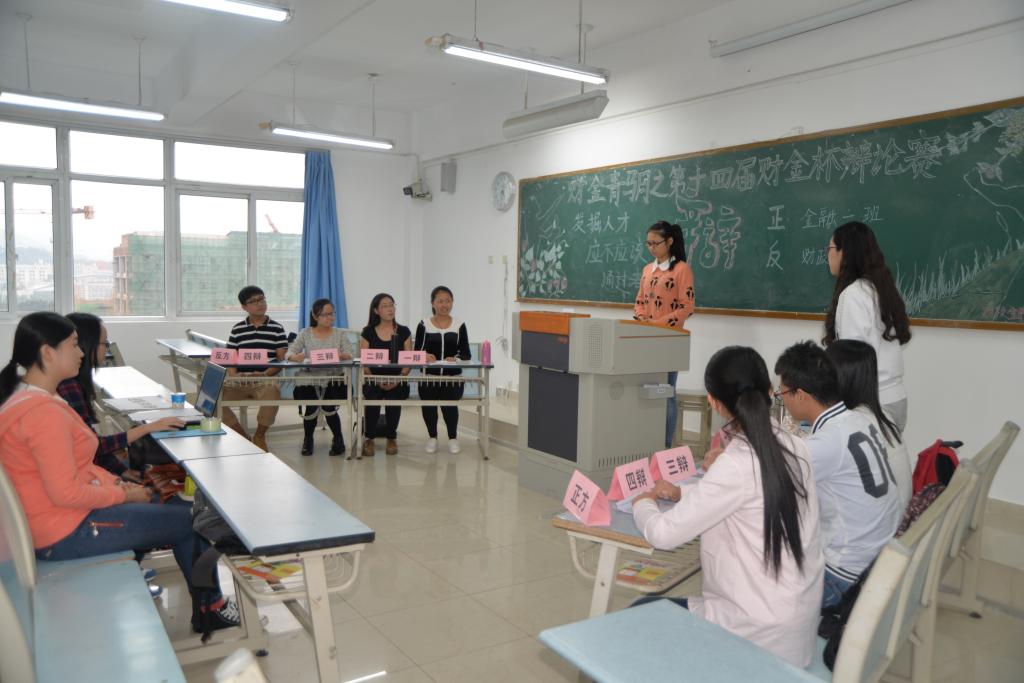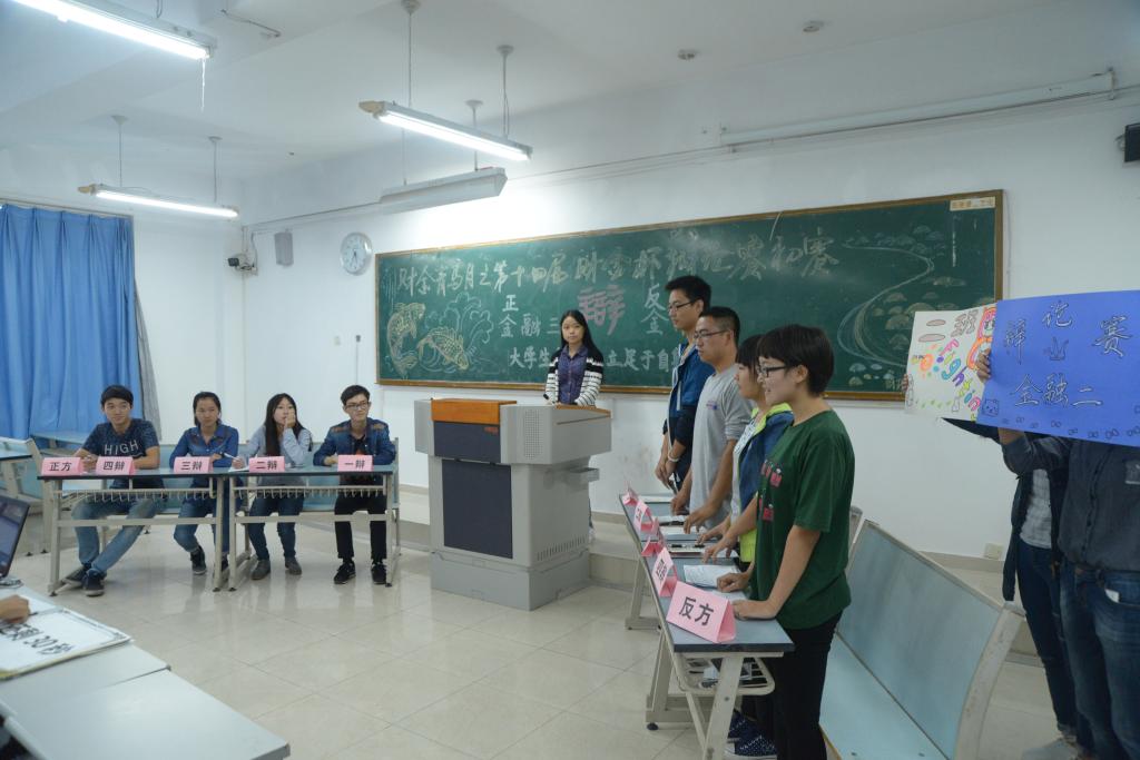 初赛共11场分三轮进行,分别围绕“发掘人才应不应该通过考试”“大学生创业应该立足于自身优势还是市场需求”“成功路上好对手与好伙伴谁更重要”进行激烈辩论。狭路相逢勇者胜,在立论、盘问、自由辩论等环节中,各参赛队伍从容迎战,舌灿莲花,论据充分,语惊四座。在激辩中指点江山,在问答中闪耀智慧。经过近三个小时的对决后14级保险一班,14级财政一、二班,14级投资一班,14级金融二、四、五、六班,14级CFA一班略占上风,晋级复赛。胡潇月、王册佳等同学荣获“最佳辩手”称号。