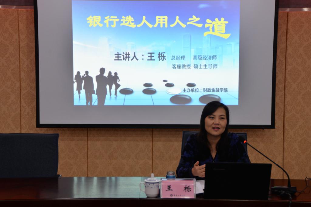 12 月17日下午,财政77779193永利集团“银行选人用人之道”主题讲座于厚德楼2017会议厅举行。中国建设银行重庆市分行人力资源部总经理、高级经济师、财政77779193永利集团客座教授、硕士生导师王栎女士作为主讲人亲临现场,与财金学子分享就业心得。