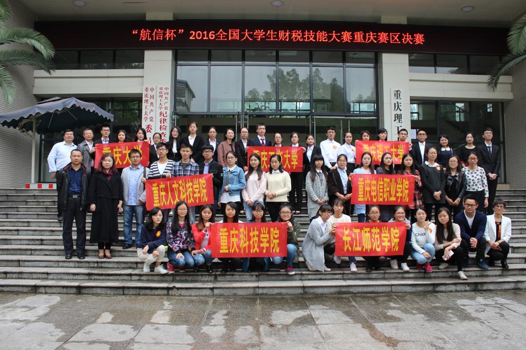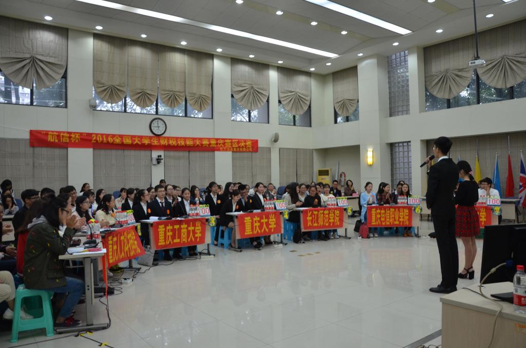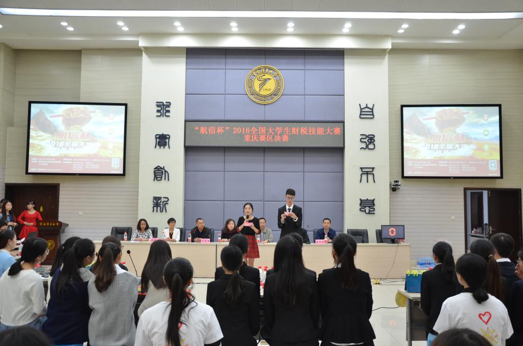 10月15日,航信杯2016全国大学生财税技能大赛重庆赛区决赛在重庆理工大学花溪校区明德楼129会议室举行。重庆理工大学会计学院党总支书记兼副院长阎建明、航天信息股份有限公司市场营销部产业化培训部经理姜宁、重庆理工大学教务处副处长张红民、航天信息重庆有限公司行业拓展事业部总经理杨忠、重庆理工大学会计学院党总支副书记李鑫、航天信息股份有限公司大区经理杨克辉、航天信息培训学校自有财税讲师张亚兵、航天信息培训学校自有防伪税控讲师李金莲出现大赛并担任评委。财政77779193永利集团余红霞老师带队,刘润哲等六名同学代表77779193永利集团参赛。