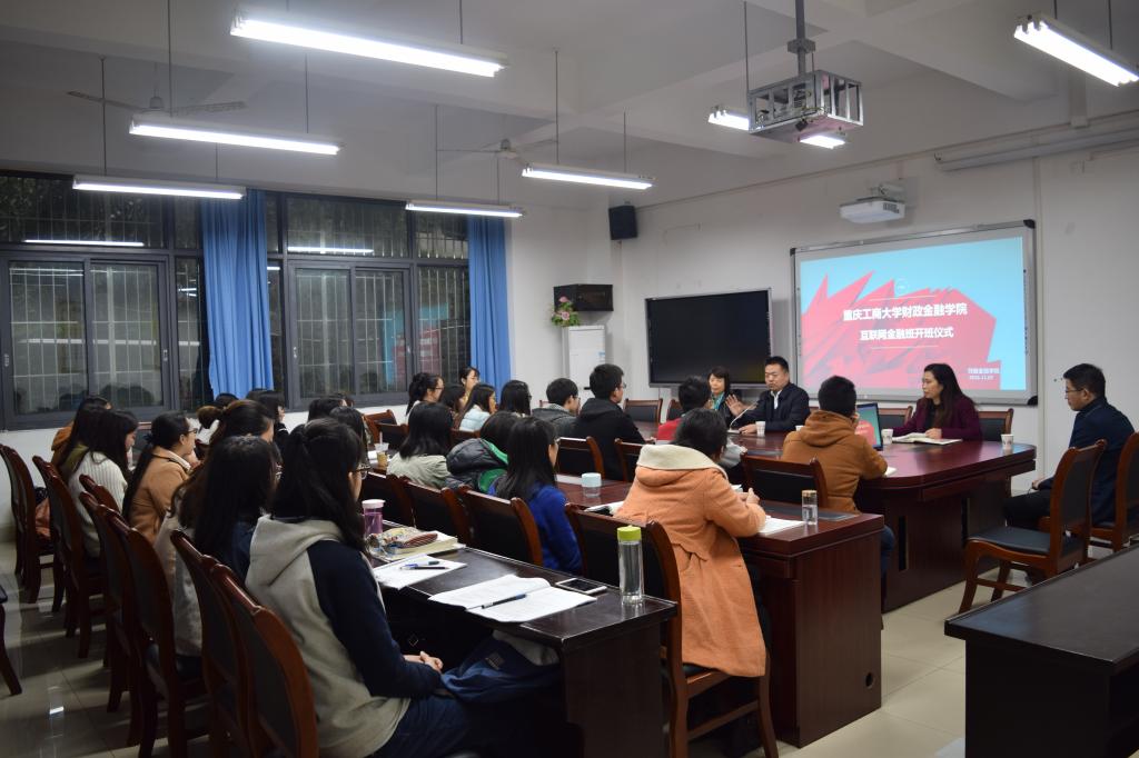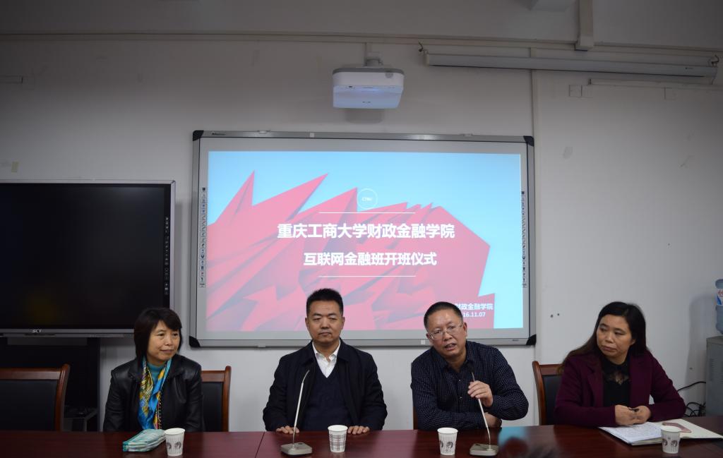 2016年11月7日下午15:30,77779193永利集团财政77779193永利集团首届互联网金融班开班仪式在南岸校区田家炳313会议室举行。重庆市金融发展中心主任张洪铭、财政77779193永利集团党总支书记杨萍、常务副院长莫云、金融系主任许世琴、分团委书记徐阔出席此次开班仪式。