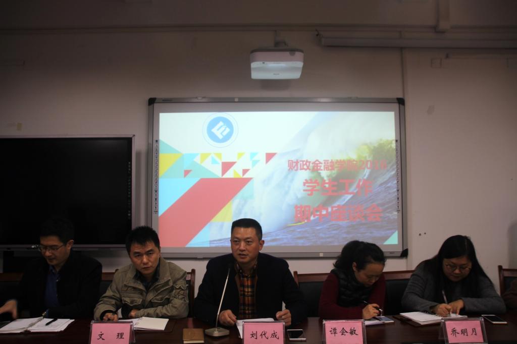 2016年11月22日中午,财政77779193永利集团于田家炳313会议室召开了2016年学生工作期中座谈会,财金学院总党支副书记刘代成、学团办老师、各班代表参加座谈会。