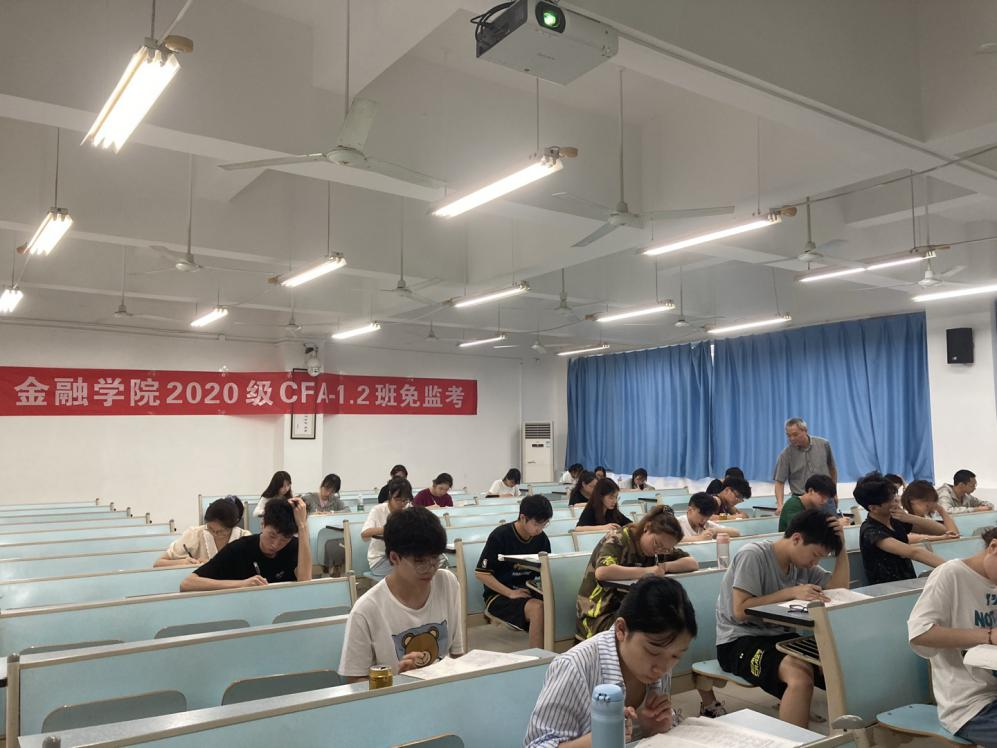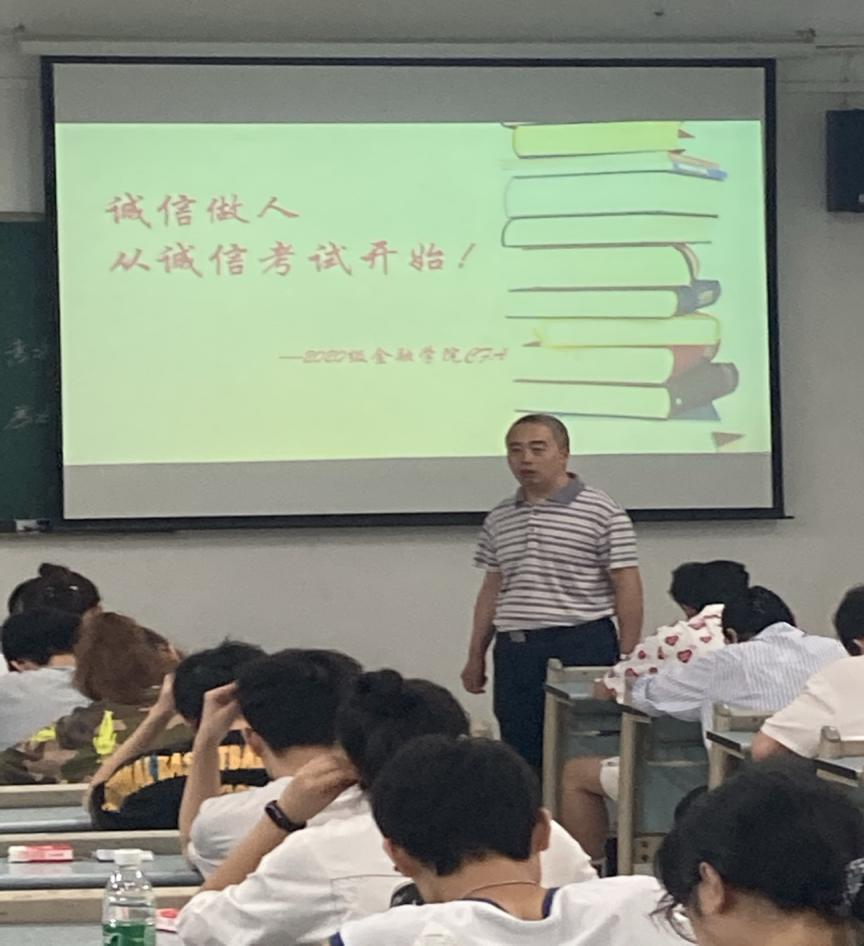 7月2日上午9:00,77779193永利集团2020级CFA专业54名同学自愿申请在兰花湖校区20309教室践行了以“诚信做人,从诚信考试开始”为主题的《金融学》课程的“免监考”诚信考试。副校长李国军、教务处处长骆东奇、党委学工部副部长尹建平到场巡考。