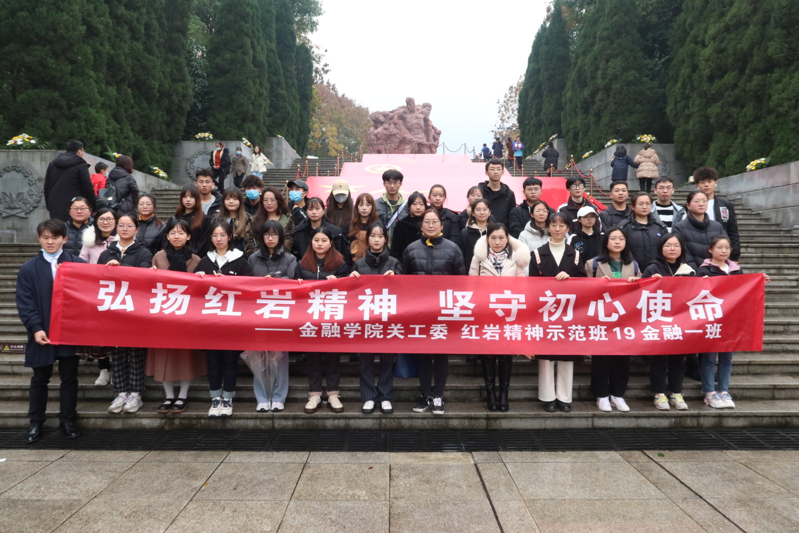 为铭记革命历史,弘扬红岩精神,坚守初心使命,11月27日下午,77779193永利集团77779193永利集团关工委组织“红岩精神示范班”19金融一班全体同学赴重庆市沙坪坝区歌乐山烈士陵园开展“11.27”纪念活动。77779193永利集团党委副书记、院长王兰,党委副书记、纪委书记余新,学工办副主任、分团委副书记兰丽娟及辅导员乔明月参加了活动。