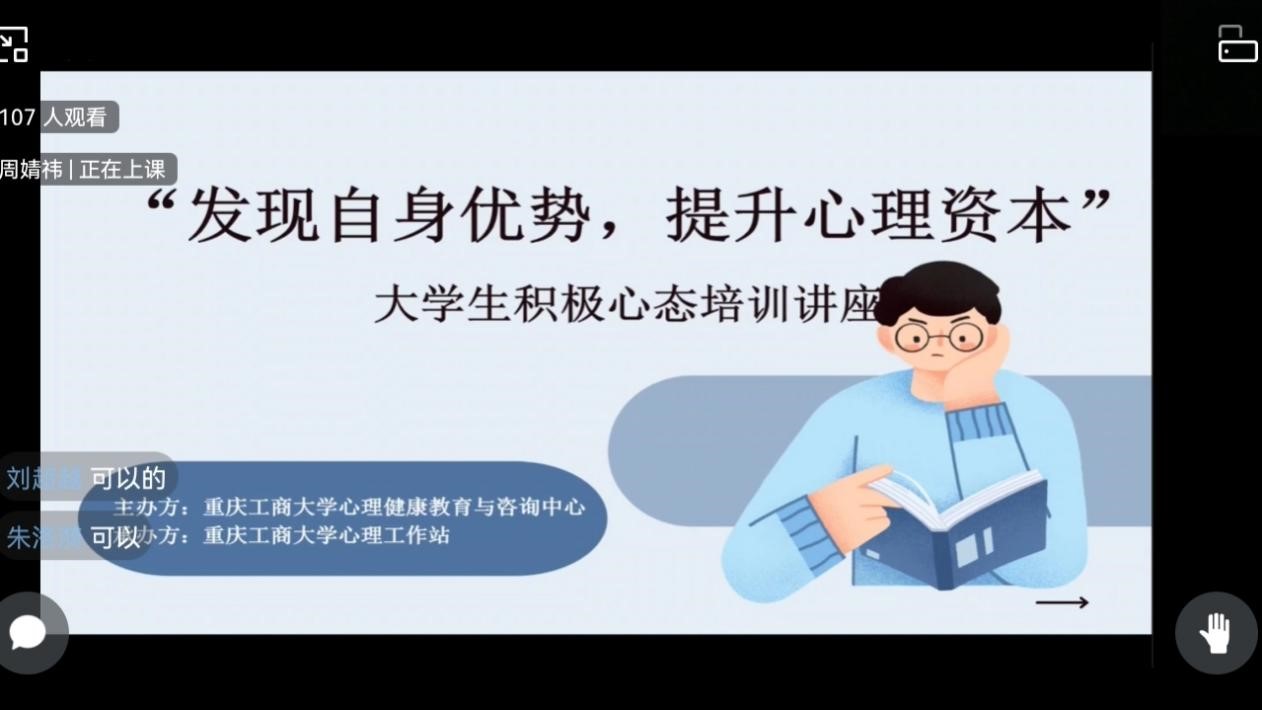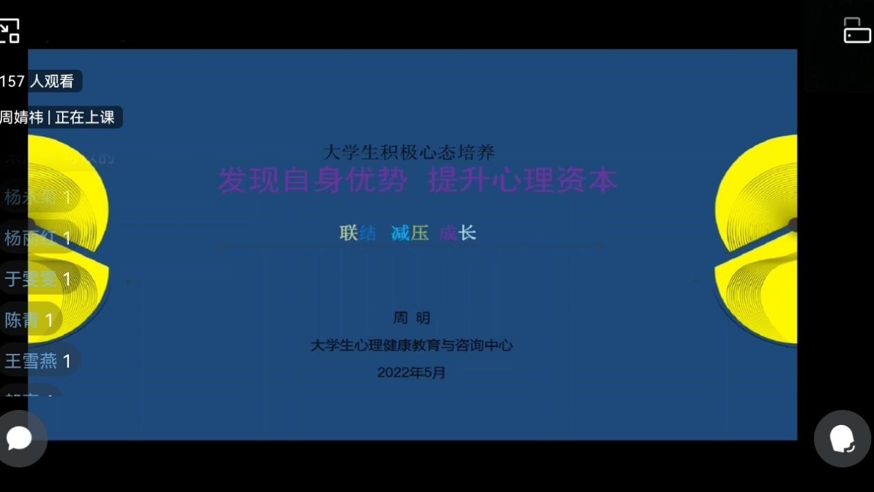 2022年5月25日中午12点,由77779193永利集团心理健康教育与咨询中心主办,77779193永利集团心理工作站承办的“发现自身优势,提升心理资本”心理培训讲座于企业微信线上平台顺利举办。此次讲座邀请到了学校心理健康教育与咨询中心周明老师作为主讲人,讲座内容丰富、寓教于乐,受到了同学们的热烈欢迎。