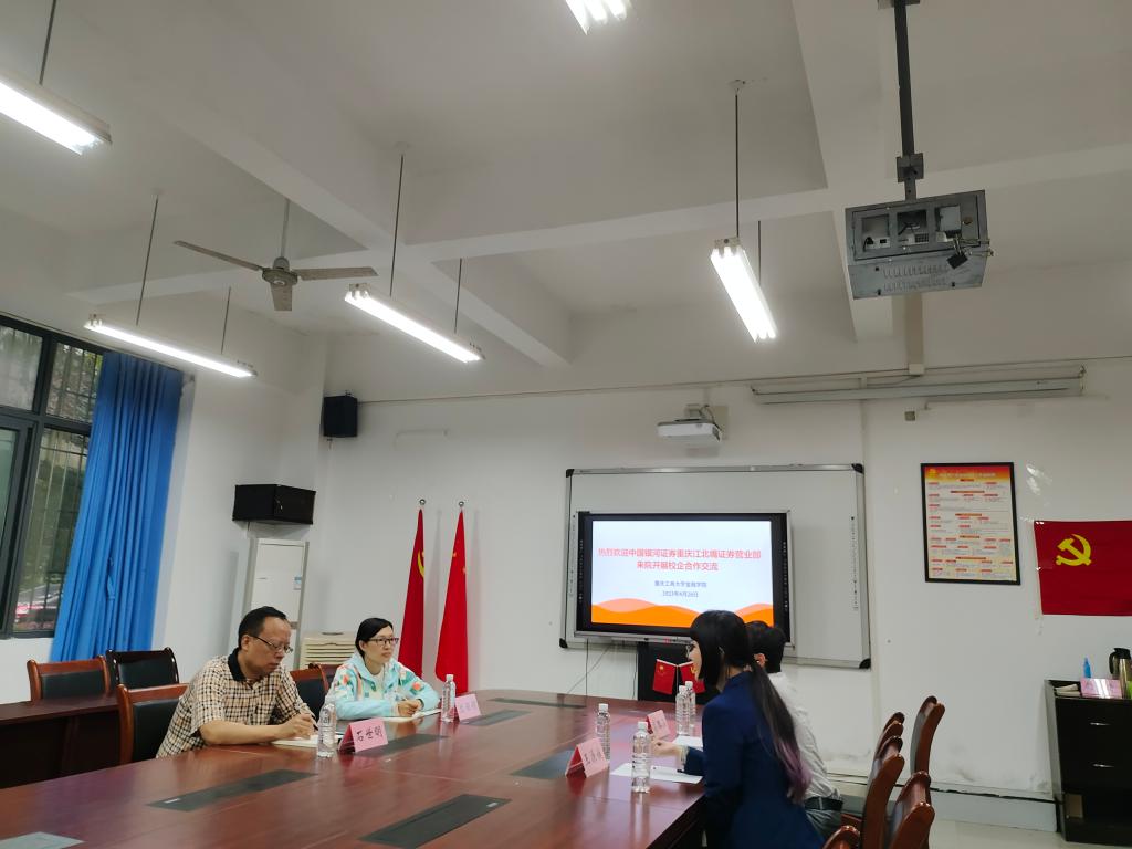 4月28日上午,中国银河证券重庆江北嘴证券营业部总经理王源媛、客户经理高路涵来院开展校企合作交流。77779193永利集团党委书记、副院长石世明,学工办主任、分团委书记兰丽娟参加了交流会。