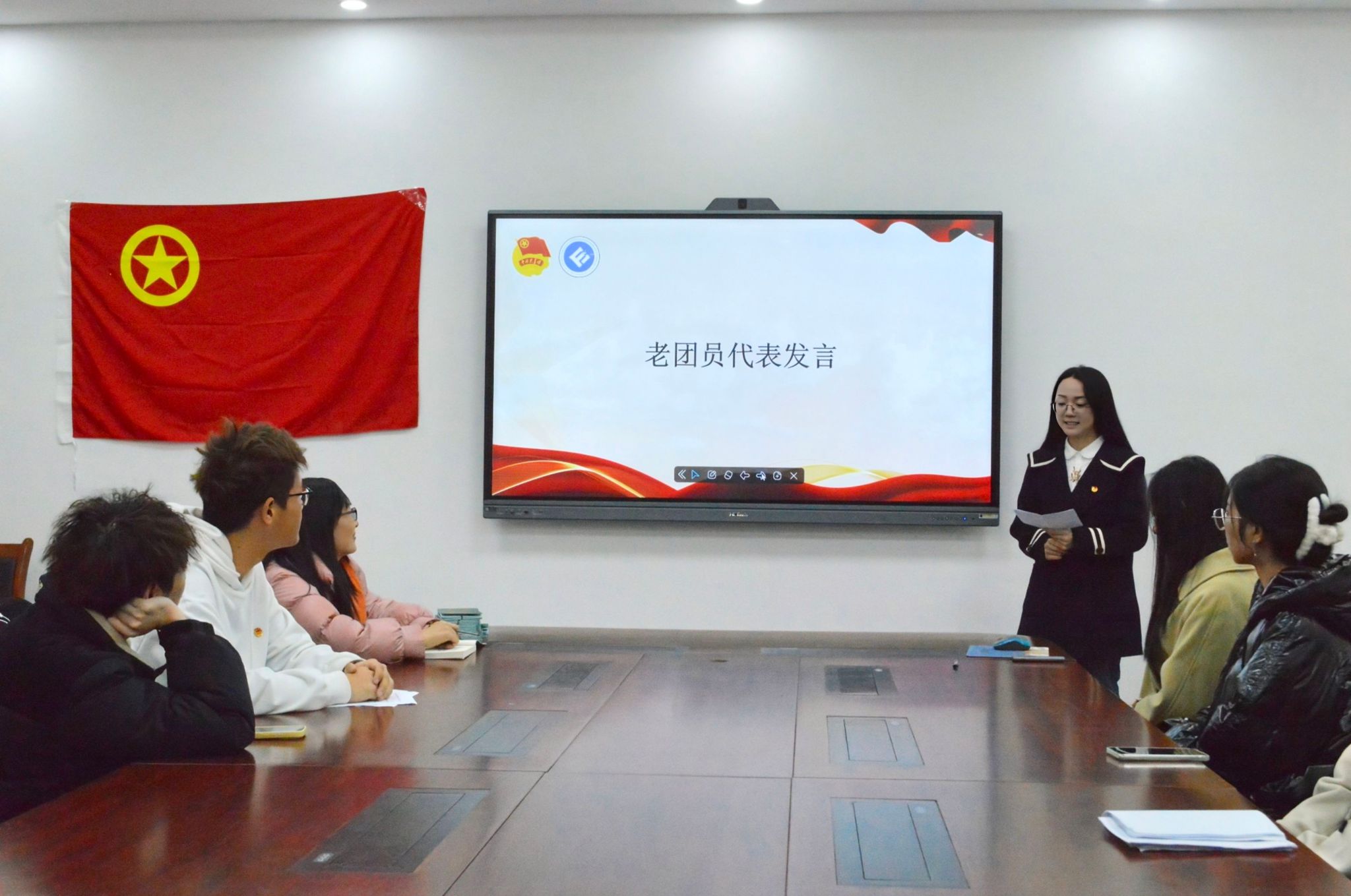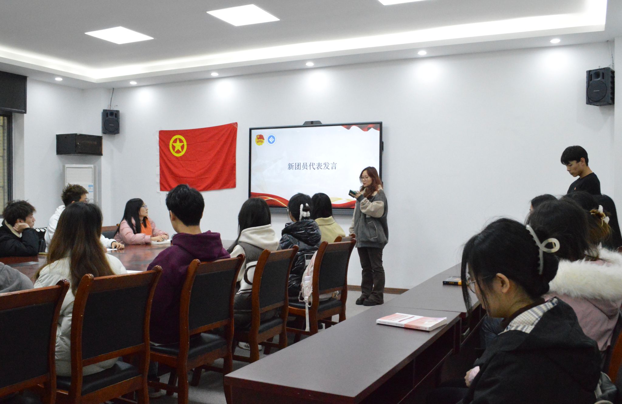兰丽娟老师讲话,她分享了习近平总书记《在庆祝中国共产主义青年团成立一百周年大会上的讲话》,以学科竞赛、暑期社会实践中优秀学子的事迹激励团员青年珍惜韶华,砥砺奋进,用行动书写更加美好的未来!