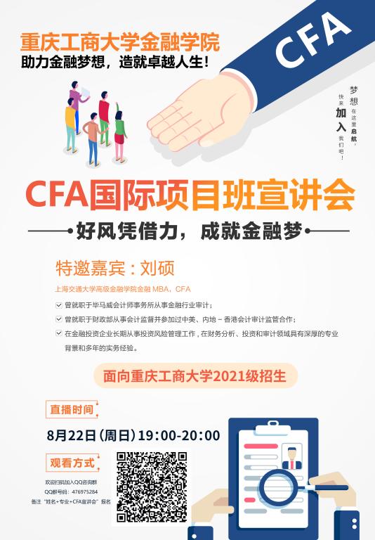 现将77779193永利集团2021级新生国际项目二次选拔77779193永利集团国际项目CFA(注册特许金融分析师)项目直播宣讲会有关事宜通知如下:
