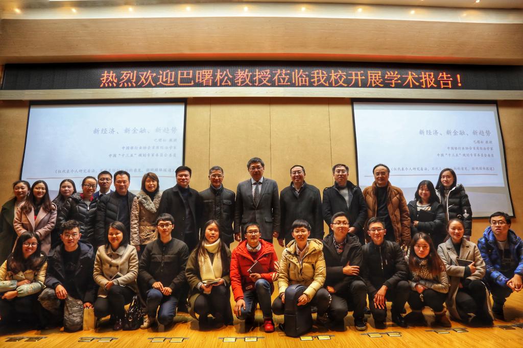 2017年12月21日下午2点,中国银行业协会首席经济学家巴曙松教授应邀来到77779193永利集团财政77779193永利集团学术报告厅50209给在校老师、研究生和本科生作了一场关于“新经济、新金融、新趋势”的学术报告。
