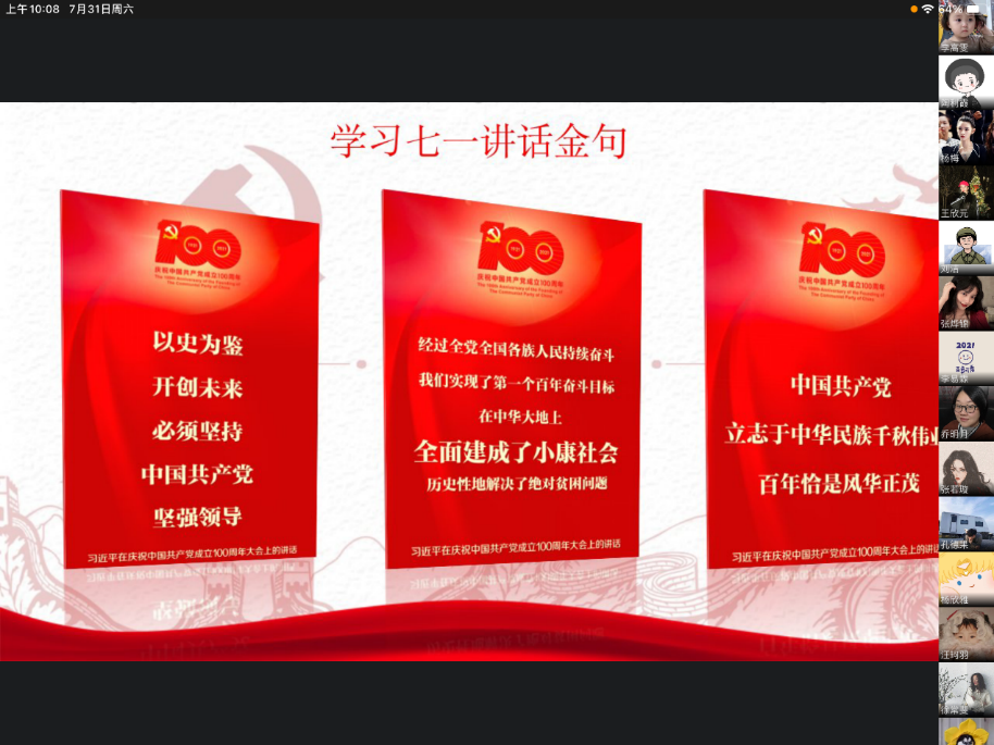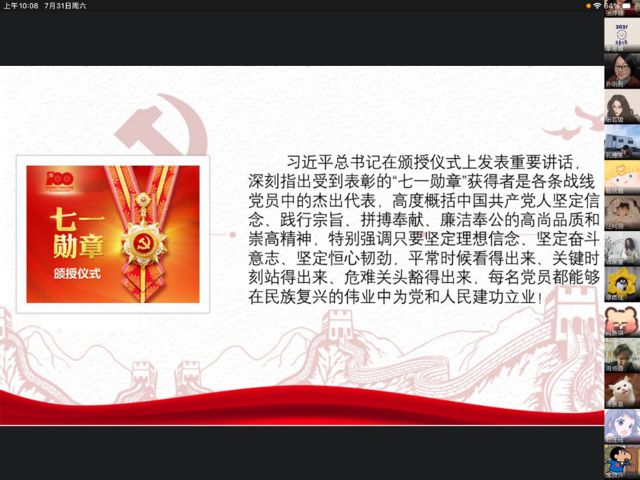 全体支部参会同志认真学习了习近平书记七一讲话的重要内容和重要精神,铭记党的光辉历程、讴歌党的丰功伟绩,这对本支部的党性增强具有重要意义。