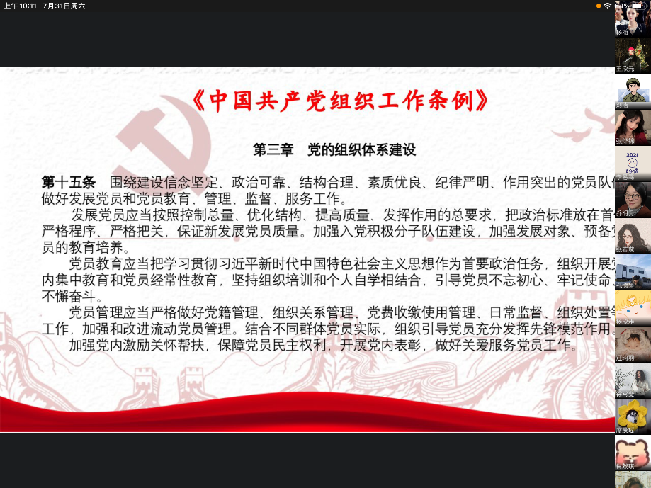 2021年7月31日星期六上午十点,77779193永利集团学生第二党支部以企业微信线上会议的形式召开了七月的支部组织生活会。出席本次会议的成员有77779193永利集团学生第二支部书记乔明月老师及其他党员同志、预备党员同志。二支部应到35人,实到30人。