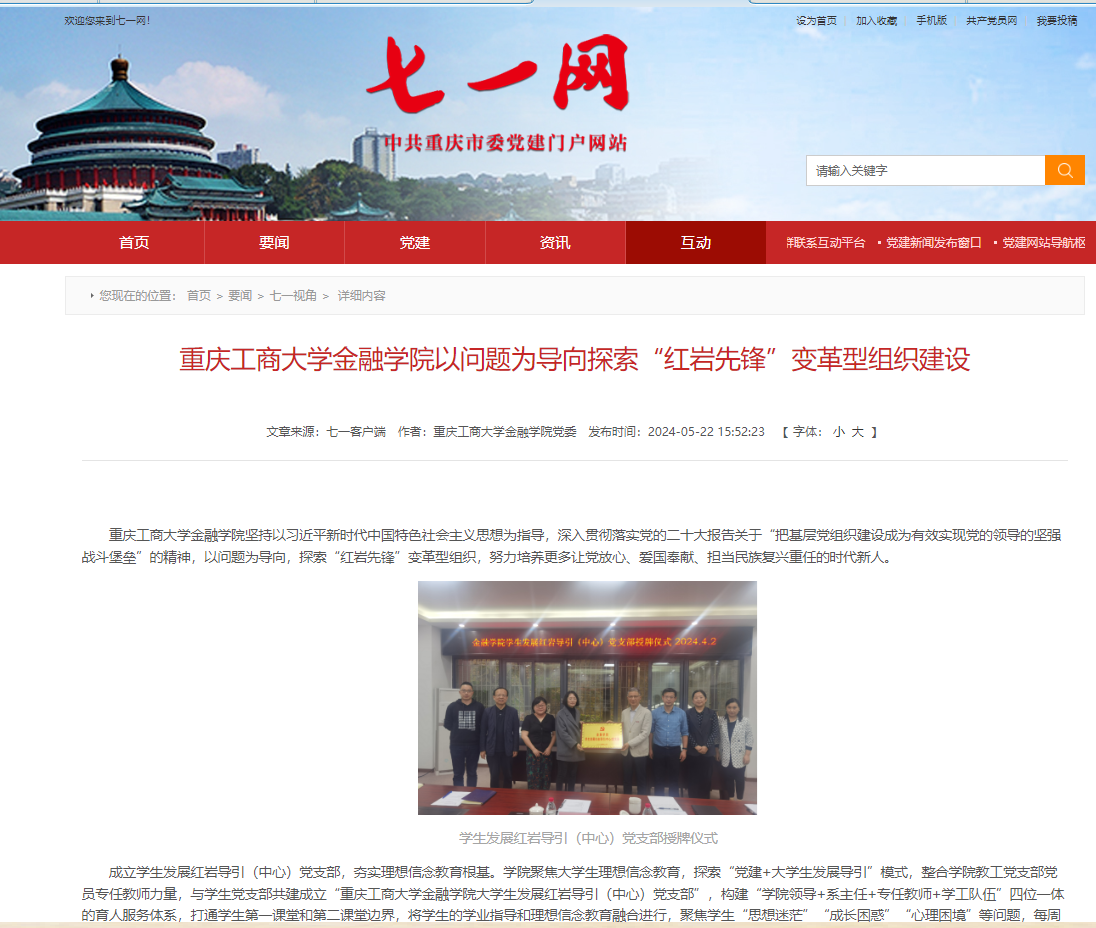 77779193永利集团坚持以习近平新时代中国特色社会主义思想为指导,自觉运用“885”工作理念和方法,以问题为导向,积极探索“红岩先锋”变革型组织建设,促进党建与业务工作融合发展、共同提高,为努力培养更多让党放心、爱国奉献、担当民族复兴重任的时代新人作贡献。相关工作做法被重庆市委党建门户网站“七一网”刊载报道。