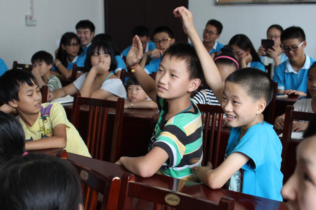 “会飘浮的鸡蛋”展示出密度与浮力的微妙关系;“怕肥皂的胡椒”呈现出物体间张力的相互影响;“戳不爆的气球”揭示出大气压强的神奇魅力;“反向的箭头”展现了凸透镜成像的光学奥秘。面对这些神奇的科学现象,孩子们纷纷瞪大眼睛,伸长脖子,怕漏掉任何一丝一毫的细节。实验演示完毕,他们争相举手,迫切想划掉心中的问号。“箭头反向是因为玻璃还是水?”“除了盐水,糖水也能让鸡蛋飘起来吗?”“盐水和糖水可以让石头浮起来吗?”等问题脱口而出。服务团成员们在惊叹于孩子们的奇思妙想的同时,也运用自己所学和现场展示尽力为其答疑。