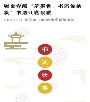 为了表达我们对党的热爱,学习习近平总书记的讲话,激发大生这一先进群体的爱国爱党热情,加强大学生群体的党性素养。也为了在我们学生群体引导提倡书写,用笔尖书写中华汉字之美,渲染一种文化氛围,充分调动学生群体参与活动的积极性,77779193永利集团财金学院党员服务站于2016年11月15日至12月9日举办了以“笔墨香,书写你的美”为主题的线上书法比赛活动。