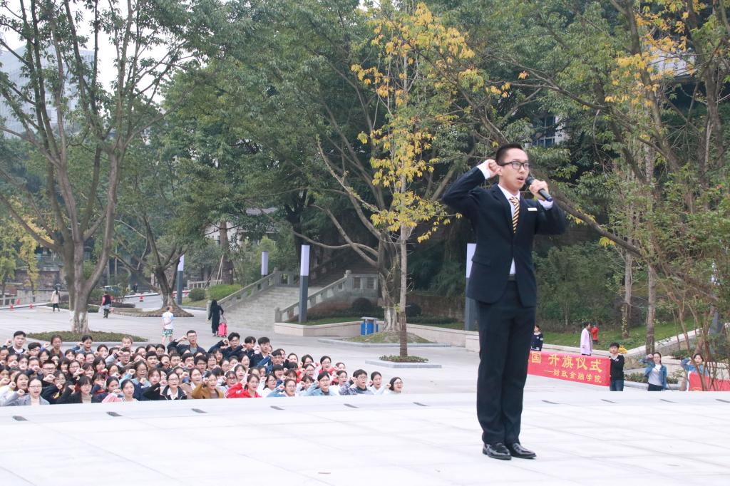 为了进一步践行党的十九大精神,弘扬“中国梦”,提高同学们的思想道德素质,激发广大师生的爱国之情,2017年11月13日清晨,由党委学工部主办,财政77779193永利集团承办 的“旗心爱国”升旗仪式于校前广场隆重举行。学工部、学生处石世明处长,财政77779193永利集团分党委黄谦副书记,学院党政办主任陈春洁老师,辅导员杨宁老师,乔明月老师以及财政77779193永利集团200余名入党积极分子参加此次升旗仪式。