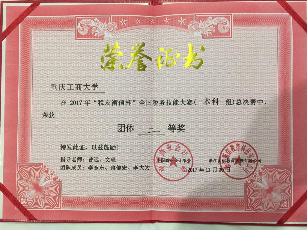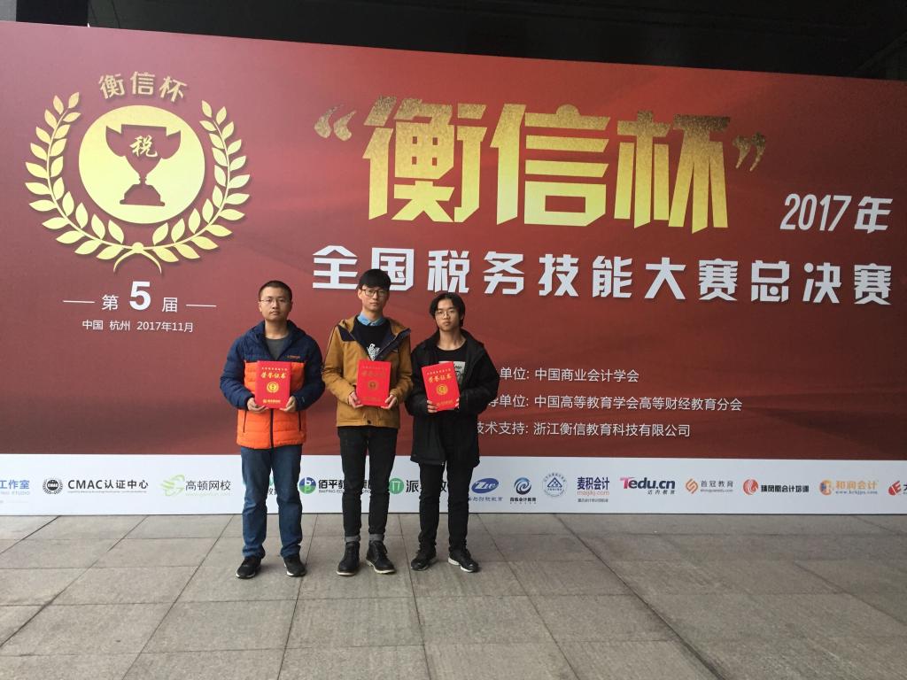 2017年11月28日下午,财金学院学生李东东、李大为、冉健宏代表永利集团官网前往杭州参加2017年“衡信杯”全国税务技能大赛总决赛。