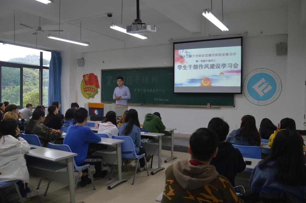接下来,财金分团委学生会副主席朱杰同学带领大家宣读了《学生会、研究生会干部自律公约》,相信学生会干部会将这份公约铭记于心,作为指引自己前进的灯盏。培训会上,王然与胡晓鹏同学也结合自身经历分享了自己的心得体会。