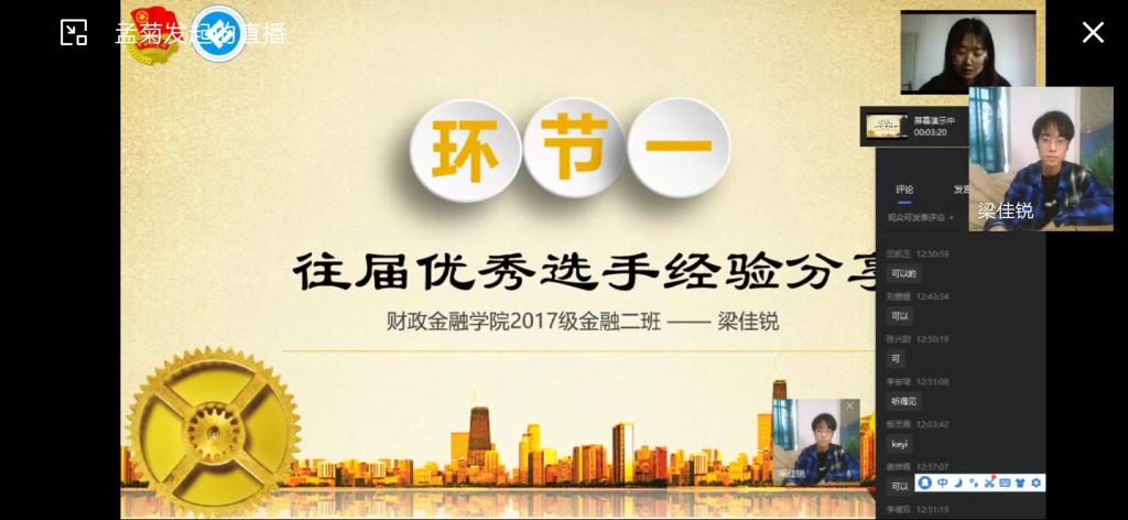 在梁佳锐同学进行经验分享的过程中,同学们也在评论区积极讨论,表现出对于此次大赛的热情。通过宣讲会,同学们对于投资管理决策大赛的整体流程和具体细节都有了详细的了解,也预祝各参赛队伍能在接下来的比赛中取得优异的成绩!