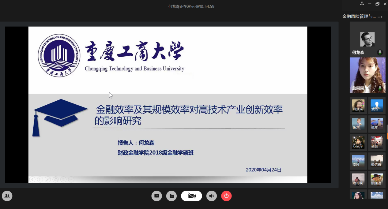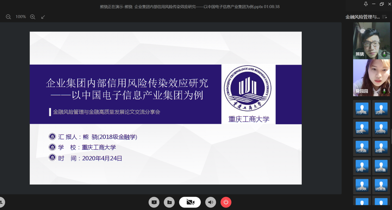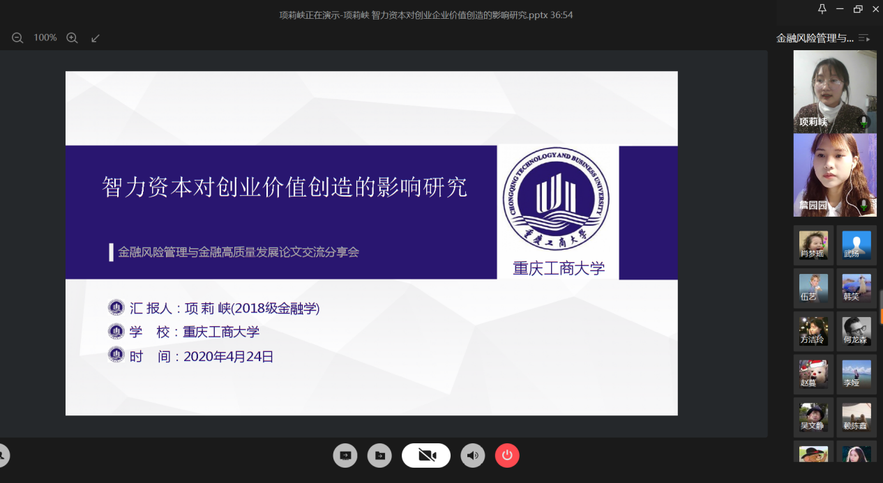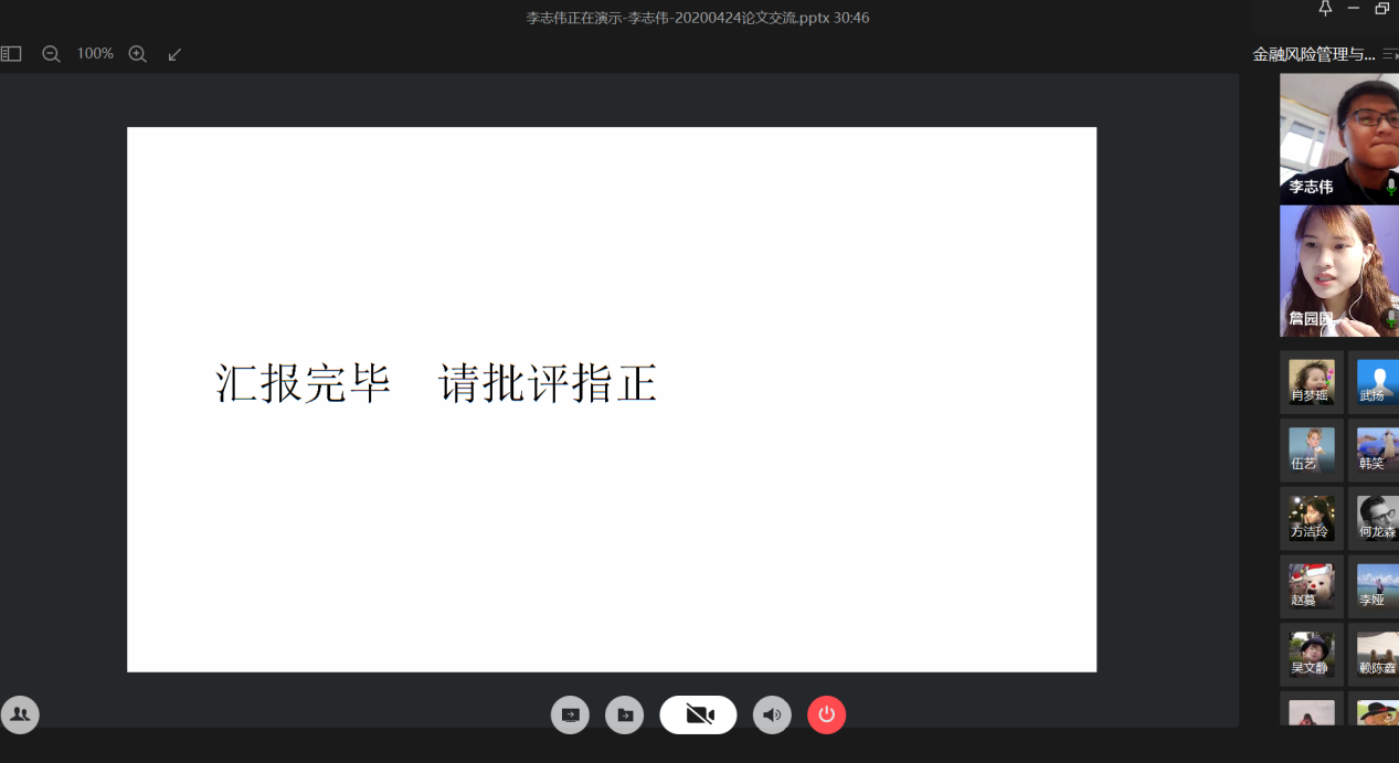4月24日晚上,财政77779193永利集团研究生分会通过腾讯会议成功举办了“金融风险管理与高质量发现”论文交流会。本次交流会由研分会的文体部部长詹园园主持,18级金融学硕的李志伟、项莉峡、何龙森、熊骁四位同学分享了他们的论文框架及论文写作经验。