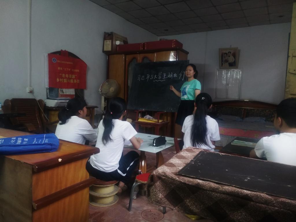 服务团成员针对乡村教育存在师资力量不足、学习资源相对缺乏等问题,对家乡的中学生开展支教活动,讲授基础理论课,帮助孩子们重温课本理论知识,帮助他们更好地学习和理解重点难点。得知本村曾发生过金融诈骗案,服务团成员利用专业所学,特地开展了一堂金融常识课程,帮助他们提升自己的金融意识,避免走入理财陷阱。扶贫必须扶志,在辅导课业的同时服务团成员还引入《习近平与大学生朋友们》进行学习理念、成长理念、价值观的宣讲。“中国开放的大门只会越开越大!”这是一位同学在听完这堂分享课之后的感想。从他们的听课专注度、他们的激情澎湃、他们的积极答复,实践团成员都真切感受到孩子们对国家对家乡的热爱以及想要成才以建设更好家乡的信念。