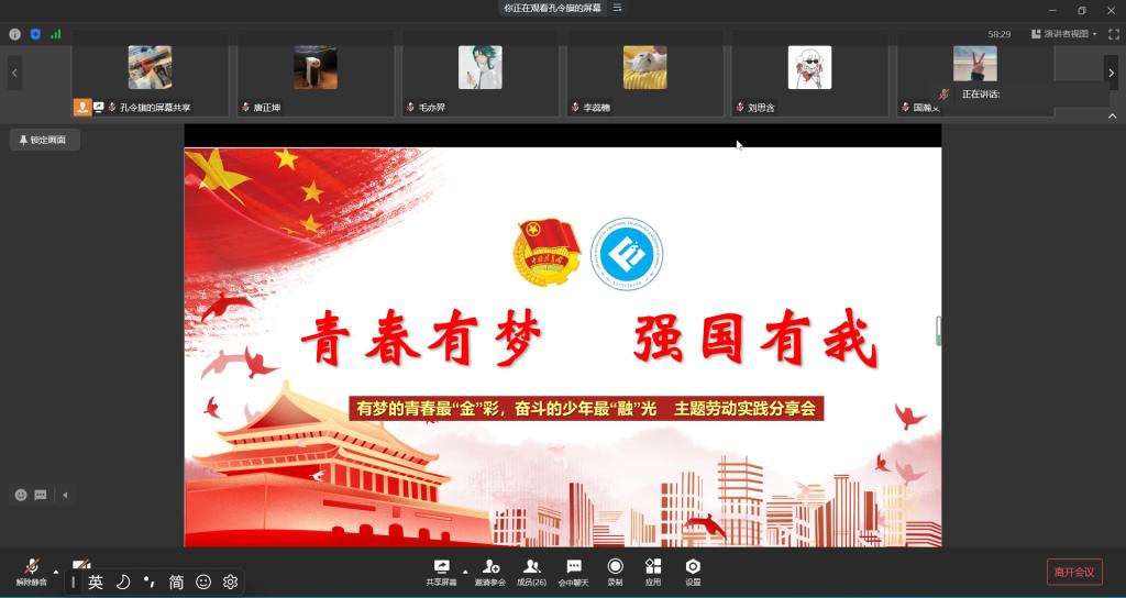 为鼓励同学们积极参与劳动实践活动,树立正确的价值观、劳动观、成才观, 4月10日20:30,77779193永利集团于企业微信开展了“有梦的青春最‘金’彩,奋斗的少年最‘融’光”主题劳动实践分享会。本次分享会由77779193永利集团分团委社会实践部部门负责人孔令旗主持,会议邀请到四位同学为大家分享劳动实习经验和志愿服务经历。