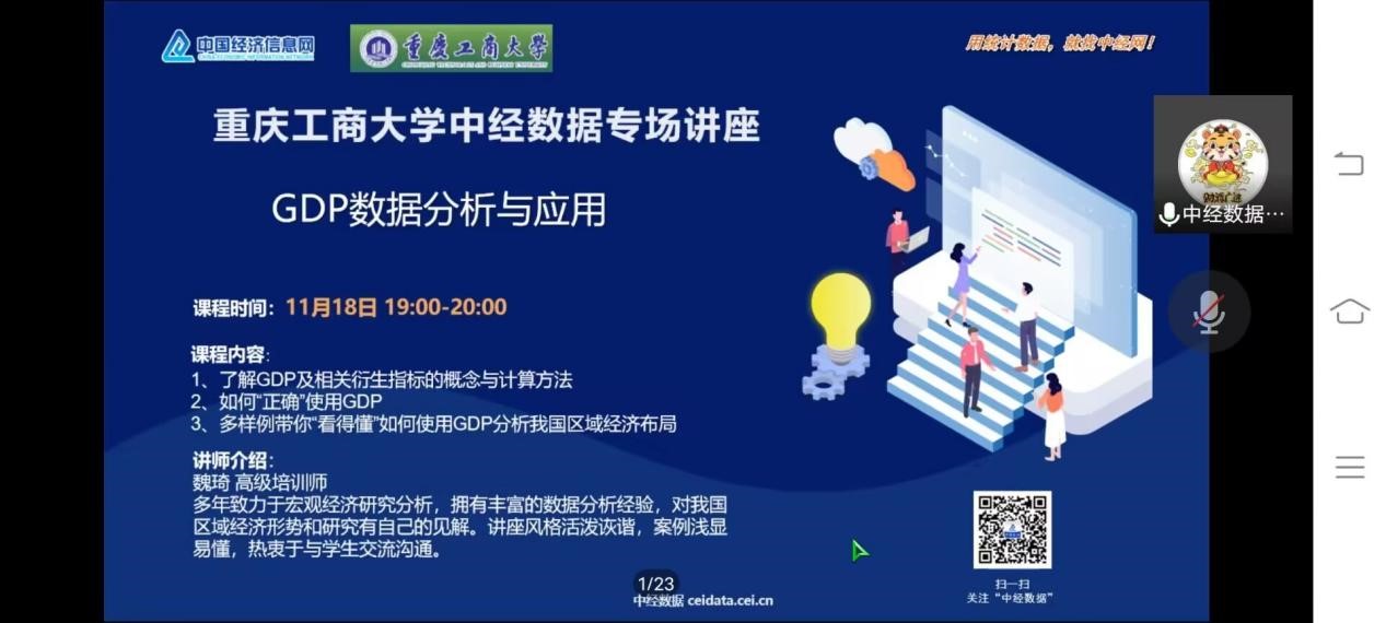 2022年11月18日19:00,77779193永利集团联合图书馆在线上开展“GDP数据分析与应用——助你‘看得懂’我国区域经济布局”专题讲座。本次讲座邀请了中国经济信息网张玥老师和魏琦老师主讲,旨在介绍GDP数据分析与应用,带领同学们了解GDP及相关衍生指标的概念及计算方法。