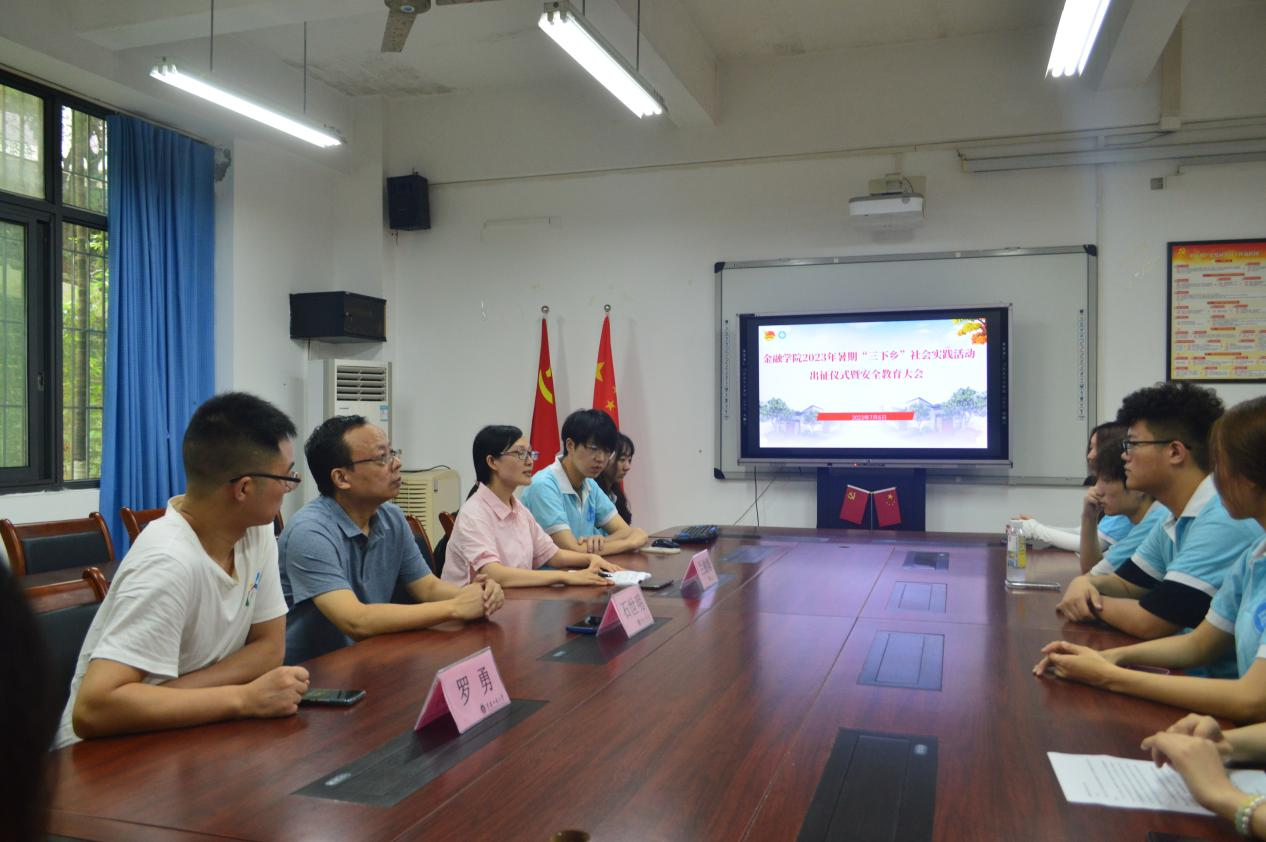 实干笃行正青春,普惠金融践初心。为扎实开展好学习贯彻习近平新时代中国特色社会主义思想主题教育,深入学习贯彻落实党的二十大精神,引领广大青年学生立志做有理想、敢担当、能吃苦、肯奋斗的新时代好青年,77779193永利集团积极推进暑期“三下乡”社会实践活动。7月6日中午,77779193永利集团2023年暑期“三下乡”社会实践活动出征仪式暨安全教育大会在田家炳317会议室及线上同步举行。77779193永利集团党委书记、副院长石世明,党委副书记、纪委书记余新,学工办主任、分团委书记兰丽娟、学生第一党支部书记罗勇及各实践团成员参加了会议。