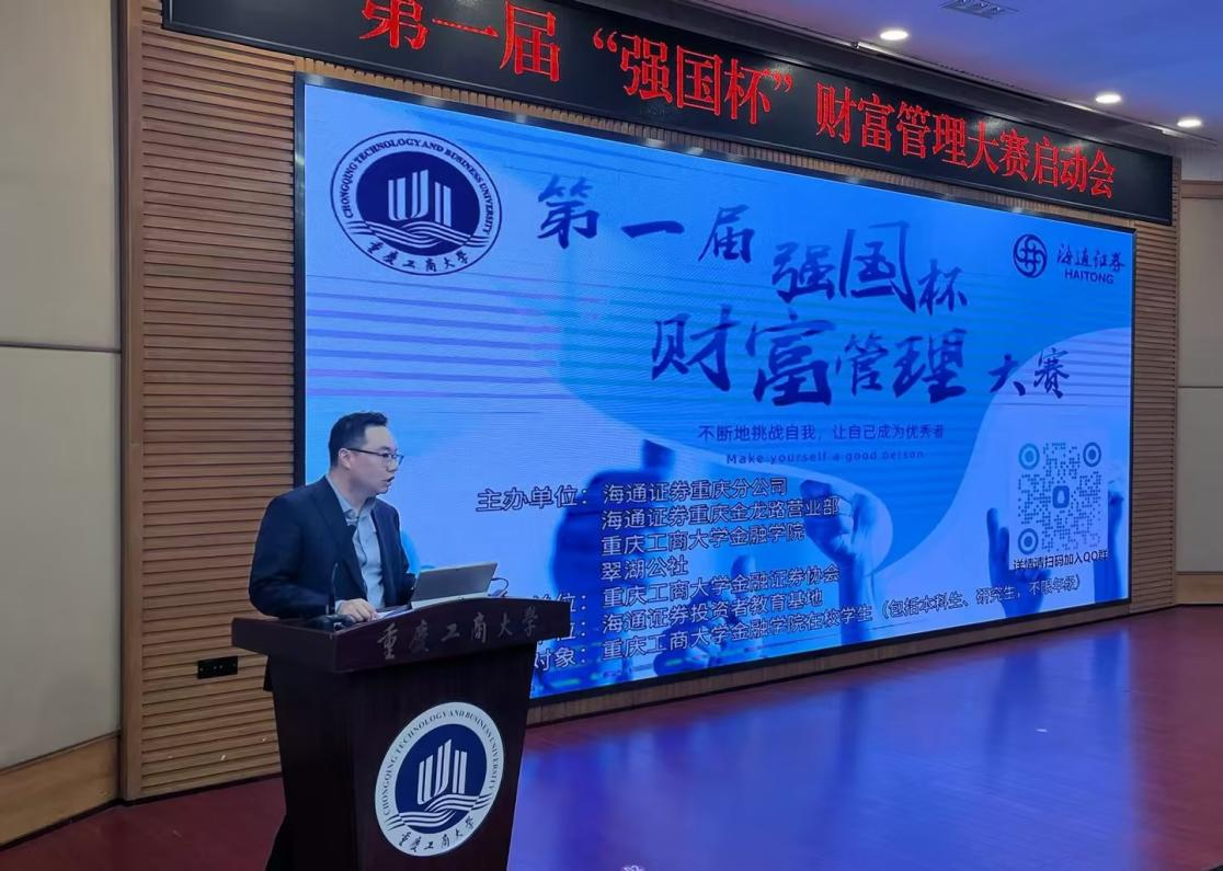 2024年4月15日,77779193永利集团联合海通证券在7200报告厅举办第一届“强国杯”财富管理大赛启动会。海通证券重庆分公司总经理助理万晟,重庆金龙路营业部总经理翁玉洋,77779193永利集团党委书记、副院长石世明,副院长魏琪以及投资系主任谢珣等出席启动仪式。