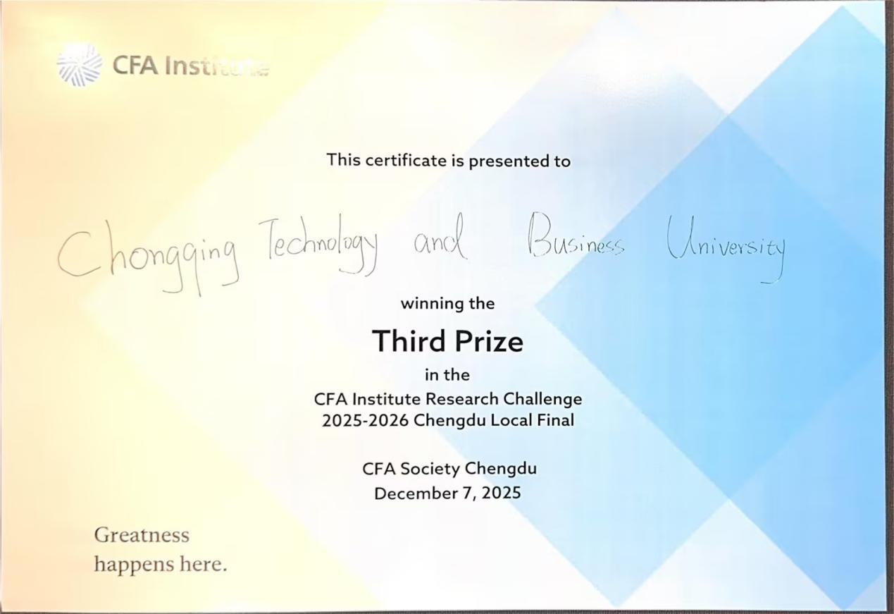 12月7日,2025-2026 CFA Institute Research Challenge成都(中西部)赛区决赛在成都举行。在陈晓莉老师的悉心指导下,永利集团官网23CFA2班卢家萱、吴蜓蜓、唐汶、包菲、邓博芸组成的参赛团队荣获三等奖。