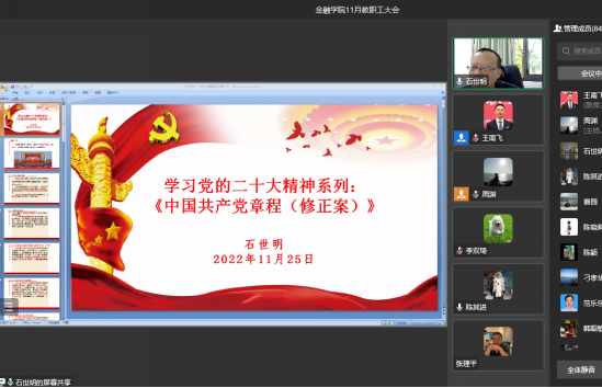 会上,石世明结合党的百年历史,向全体教职工讲解了《中国共产党章程》的起源、修改等知识,重点向大家宣讲了党的二十大关于《中国共产党章程(修正案)》的决议。