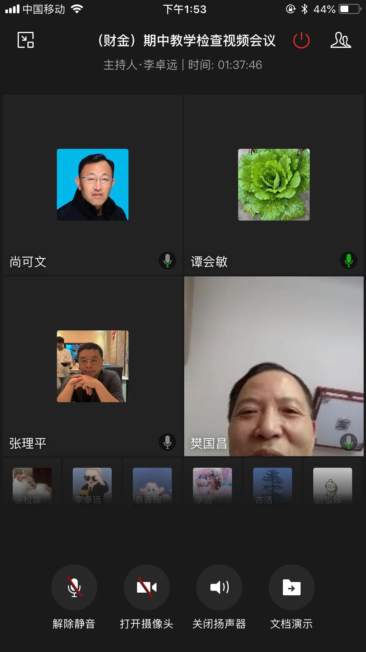 2020年4月29日,财政77779193永利集团召开期中教学检查视频会议。会议由财政77779193永利集团校级督导保险学系樊国昌教授主持。学院教学院长王兰教授、院级督导、各系主任和学院教学管理老师,2017级、2018级各班以及2019级CFA专业的学习委员参加了此次视频会议。