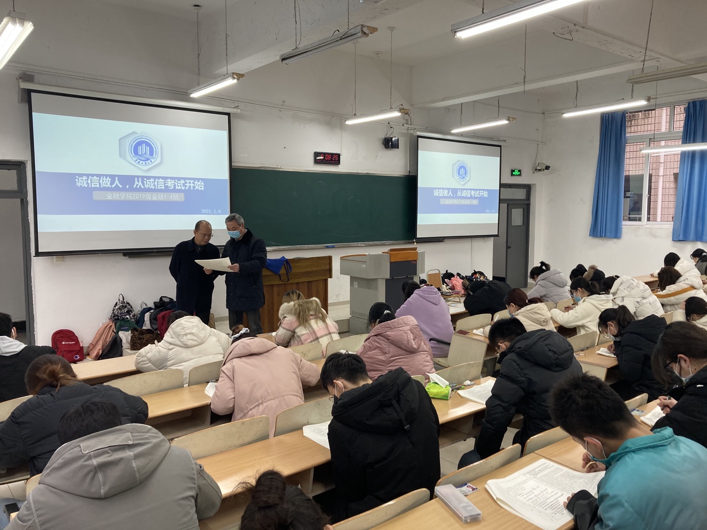 为培养具有“新儒商”精神的新时代大学生,践行“诚信做人,从诚信考试开始”的誓言,2021年1月6日77779193永利集团2019级金融学专业共计159名学生自愿申请在博智楼07207和07208教室举行《金融学》课程的“免监考”诚信考试,这是77779193永利集团首次举行的“免监考”诚信考试,副校长李国军教授、校长助理谭松涛教授前来巡考。