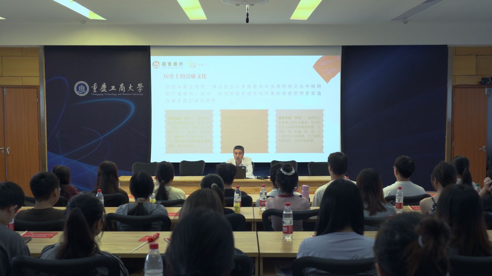 本次活动,77779193永利集团77779193永利集团将“红色金融”与“清廉金融”有机结合,邀请招商银行重庆分行纪委副书记、纪委办公室主任、监察部总经理唐晓新同志以《守正为心 笃行不怠 为新时代廉洁文化建设贡献青春力量》为题,从传统文化“三清”思想、清廉文化的内涵、新时代清廉金融文化建设、招商局的红色金融发展历程等方面为金融专业同学授课,并勉励大家要将红色金融、清廉金融贯穿于学习和工作的全过程,激发青春正能量。