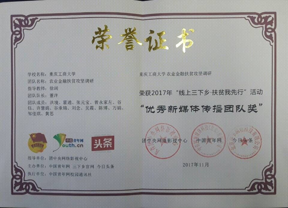 近日,永利集团官网农业金融扶贫攻坚调研团荣获2017年团中央“线上三下乡·扶贫我先行 ”活动“优秀新媒体传播团队奖”, 据悉,在此次活动中,农业金融扶贫攻坚调研团在线上为30万余人答疑解惑。