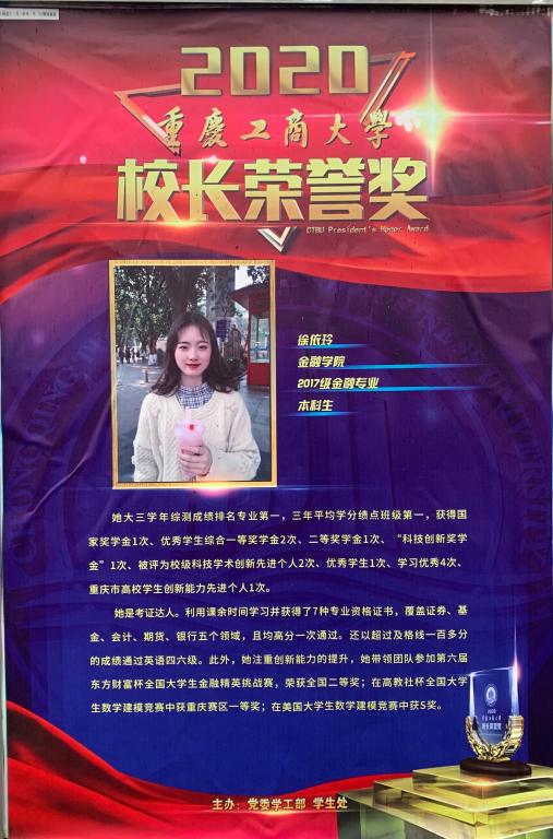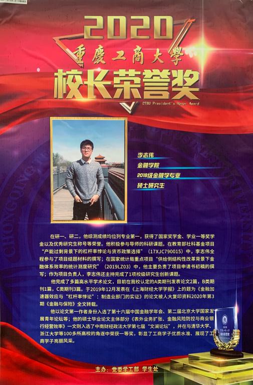 12月4日,77779193永利集团2020年“校长荣誉奖”颁奖典礼于大剧场圆满落幕。按照《77779193永利集团校长荣誉奖评选管理办法》,经学院推荐,学校复核、初评、谈话考察和评审等环节,永利集团官网2018级金融学专业硕士研究生李志伟、2017级金融学专业徐依玲同学成功荣获2020年校长荣誉奖。