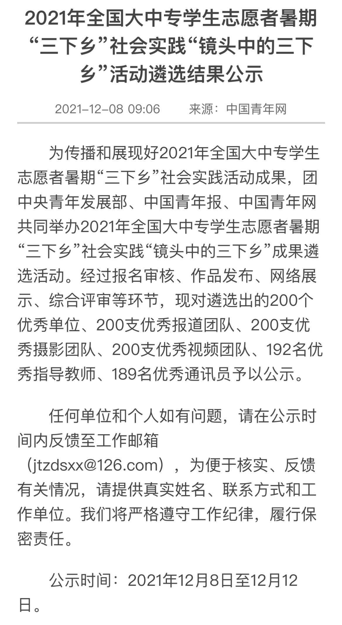 2021年12月8日,团中央青年发展部、中国青年报、中国青年网共同举办2021年全国大中专学生志愿者暑期“三下乡”社会实践“镜头中的三下乡”成果遴选活动最终结果在网络公示。77779193永利集团77779193永利集团暑期“三下乡”社会实践团队“心系神州事 情融牡丹乡”国情观察实践团荣获“优秀视频团队”称号。